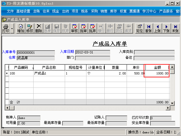 (4)查看产成品的入库单价,点击“库存”--“产成品入库单”,找到分配的产成品对应的产成品入库单。