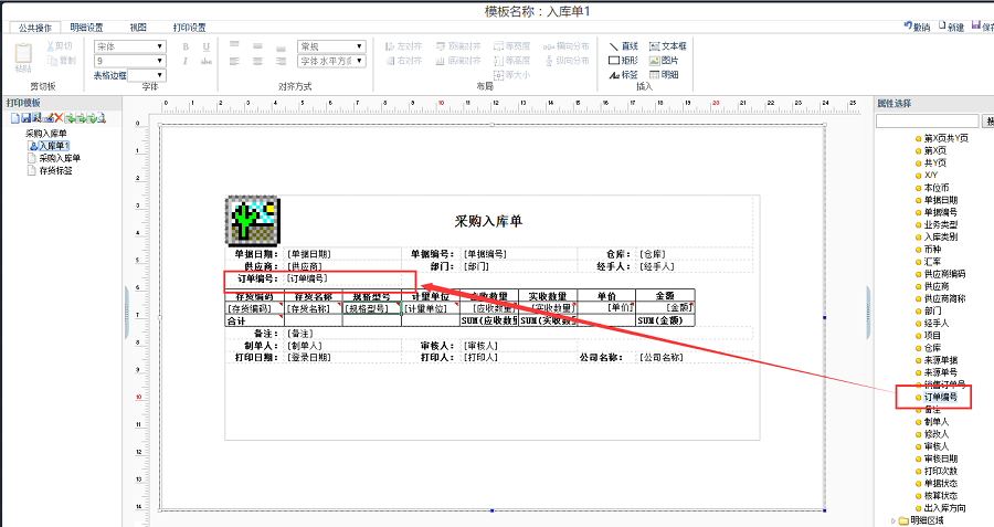 第五步:设置采购入库单打印模板将表头字符公用自定义项-订单编号设置到表头上,另存为新的打印模板。
