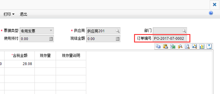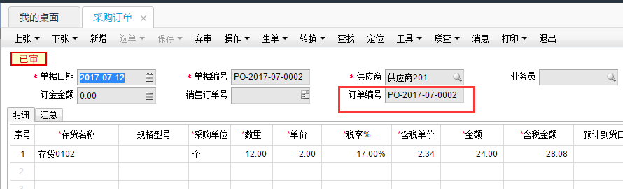 第二步:打开采购订单,新增采购订单,无需手工录入表头字符公用自定义项-订单编号。