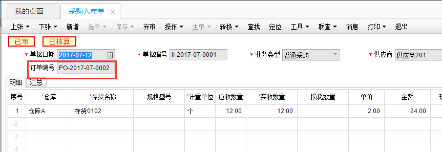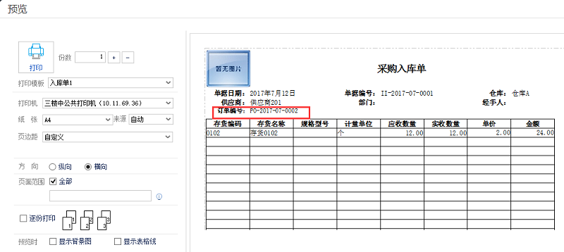 张会计:@服宝 客户的流程是采购订单-进货单-采购入库单。库管想要在采购入库单上看到是由哪笔订单生成的,并且打印出来,可是库管发现在采购入库单上怎么找都找不到订单号,怎么办啊?