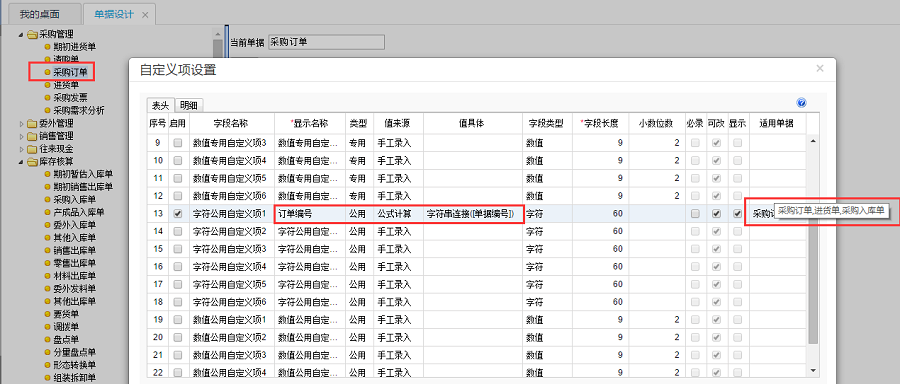 第一步:打开单据设计-采购订单-自定义项设置-启用表头字符公用自定义项,值来源选择公式计算,值具体选择单据编号,适用单据采购订单、进货单、采购入库单保存设置。