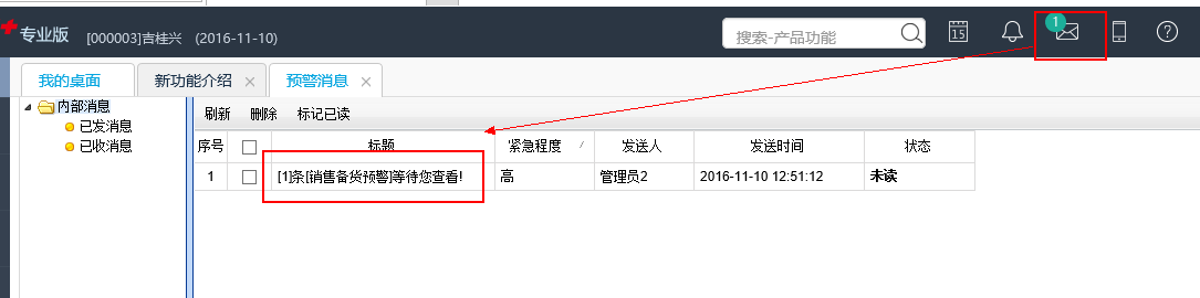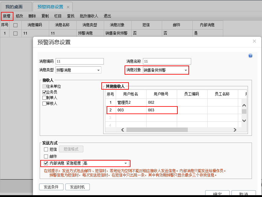 新增预警消息设置,消息对象为【销售备货预警】,选好消息接收人和其他接收人,发送方式为内部紧急就可以: