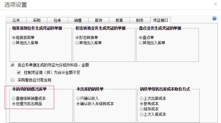 系统管理—选项设置—凭证接口—未销货的出库单,选处理为发出商品。