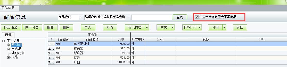 勾选上后,数量小于等于0的商品档案就会被过滤掉。