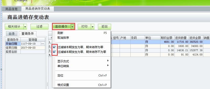 在查看【商品进销存变动表】或是【仓库进销存变动表】,商品显示不全?在【高级操作】里有“过滤掉本期发生为零、期末结存为零”和“过滤掉本期发生为零、期末结存不为零”这两个选项,如果查询的期间发生为零,我们可以选择是否过滤掉而不显示出来。