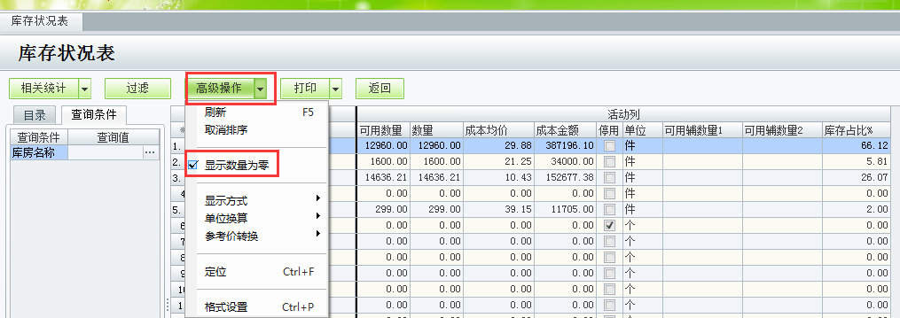查看库存状况表中,在高级操作下面有【显示数量为零】,如果没有勾选,那么数量为零的商品也不会显示出来。