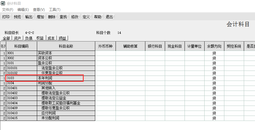 1)在基础档案的会计科目中看一下本年利润科目的科目编码;