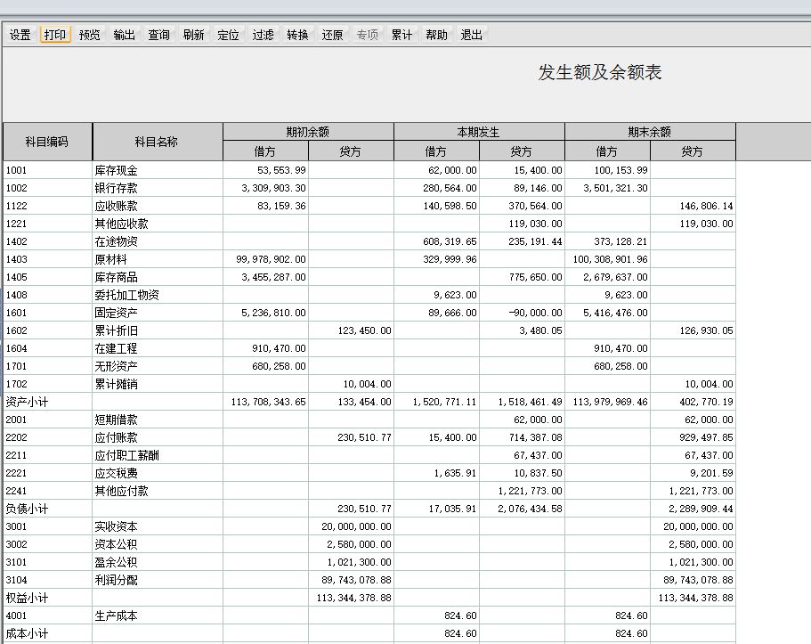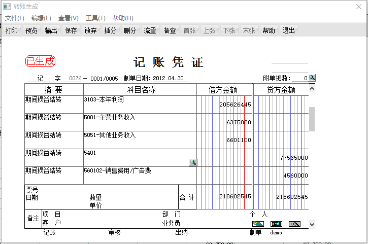 可以看到在余额表中损益类科目还有余额,并没有将损益类科目的余额转到本年利润科目中,需要在转账生成中进行期间损益结转