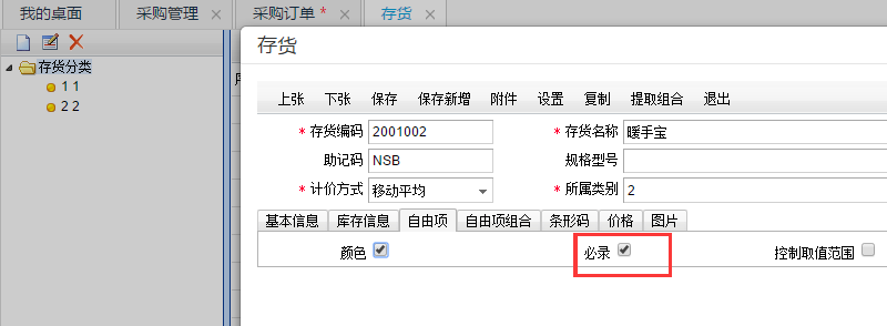【基础设设置】-【存货】-【自由项】中有必录的控制: