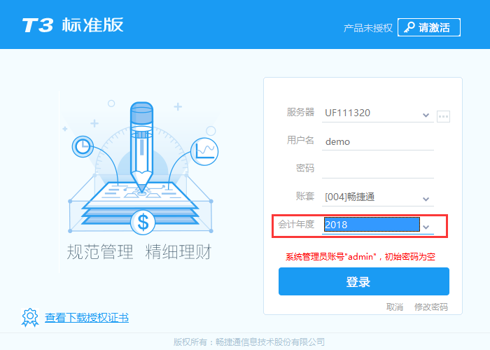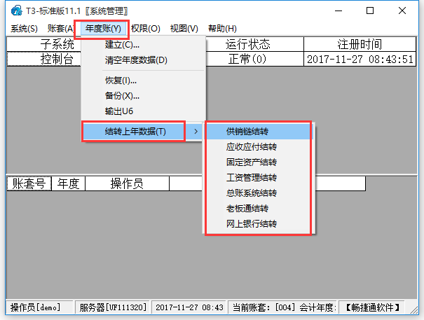 然后再重新登录系统管理,年度选择2018年登录,点击“年度账-结转上年数据”去结转各个模块的数据,才会将上年末的余额结转到新年度的期初中。
