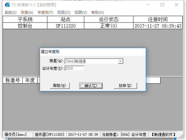 首先来看下年的年度账的建立,T3/T6要用账套主管登录系统管理,点击“年度账-建立”,先建立2018年的年度账。