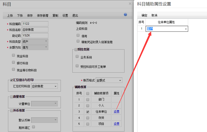 【基础设置】-【科目】-【设置】-【往来单位属性】中选择【客户】,这样做凭证时,1122应收账款科目带出的只是客户档案了