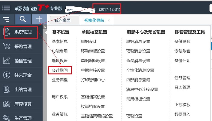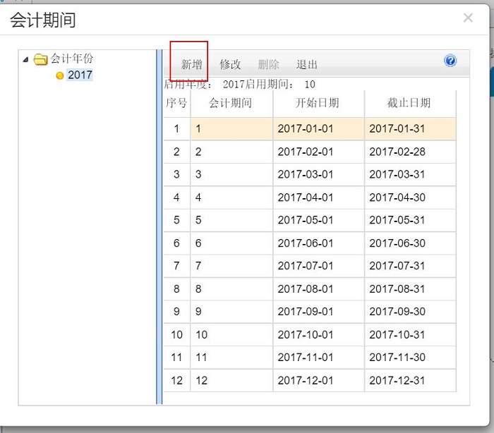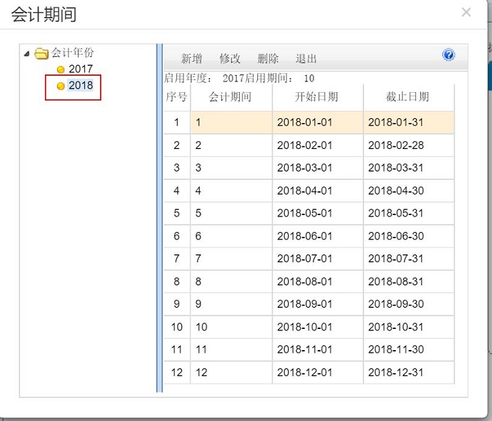 (1)用账套主管选择2017年12月31日登录软件,点击系统管理中的会计期间,然后弹出会计期间的界面。