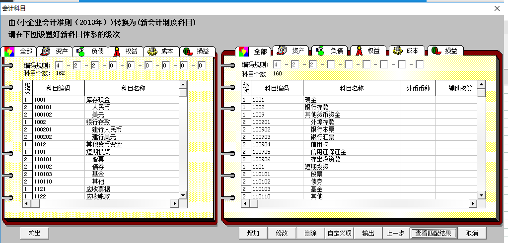 工具会给出两个科目体系的对比。如下: