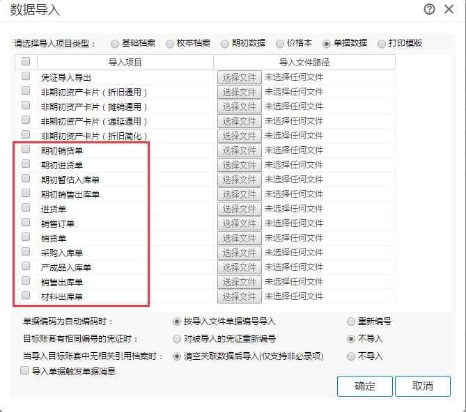 期初销货单、期初进货单、期初暂估入库单、期初销售出库单、进货单、销售订单、销货单、采购入库单、产成品入库单、销售出库单、材料出库单。