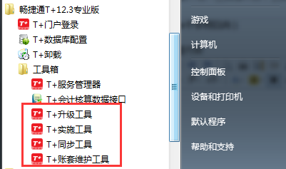 神奇的T+工具箱,安装好了T+12.3专业版,点开【开始】-【所有程序】-【畅捷通T+12.3专业版】-【工具箱】,居然有现成的四个工具,见下图:
