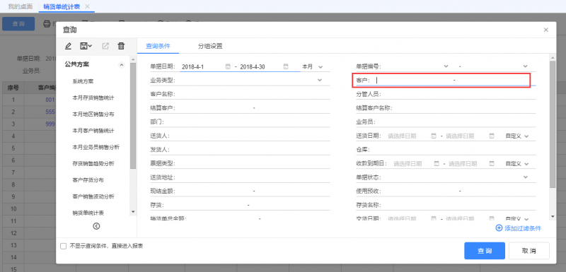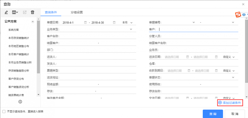 销货单统计表的查询条件,点击【添加过滤条件】,