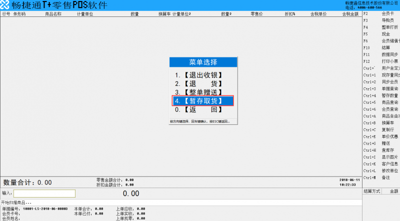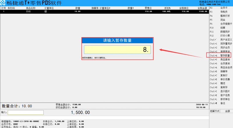 2、POS端开单时,先录入本次销售商品,再指定本次销售商品的暂存数量,并完成收银。