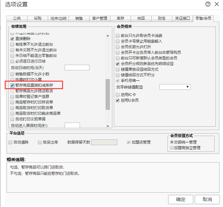 1、系统管理-选项设置-零售选项中,将“暂存商品直接扣减库存”取消勾选。