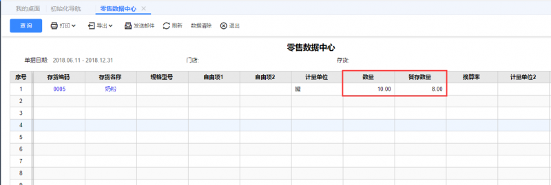 3、查看零售数据中心,这笔零售单可显示暂存数量。