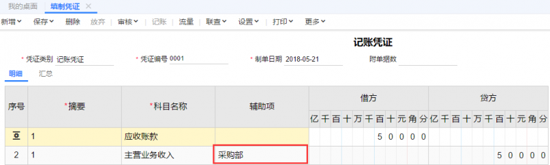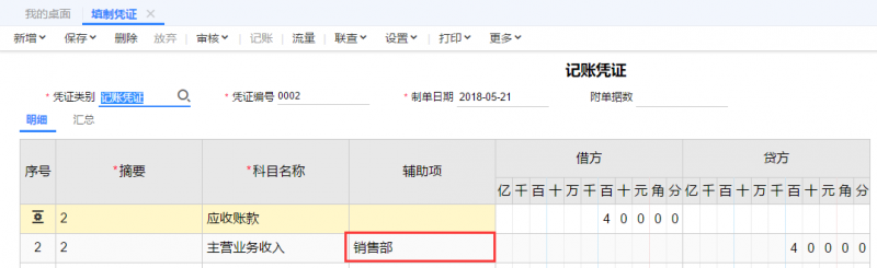 2.填制2张凭证,主营业务收入科目的辅助核算,分别为采购部和销售部