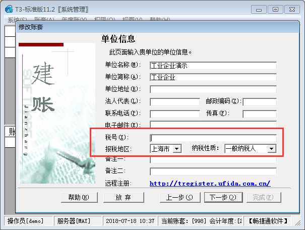 使用一键申报前,需要先对纳税信息做好设置,以账套主管登录到【系统管理】,点击【账套】—【修改】,点击下一步之后的界面上,可以录入税号、选择报税地区及纳税性质,目前支持上海地区,其他地区陆续上线,敬请期待~