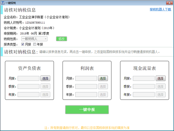 点击【总账】-【一键报税】-【国税申报】,核对信息是否无误,选择报表类型,