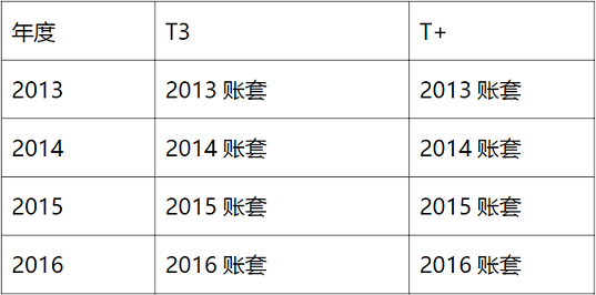 1、把T3多个年度账套升级到T+,升级之后在T+里是每个年度一个账套:例如: