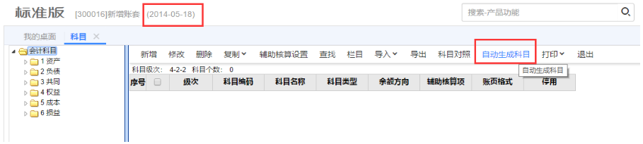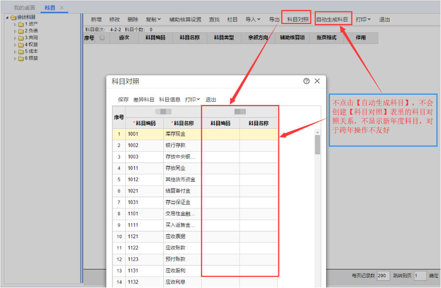 (1)分别用2014、2015、2016年度登陆账套,进入“科目档案“点击”自动生成科目“按钮,会根据上年度2013年度科目自动生成新年度的科目。这样的好处是”科目对照“自动设置关系,便于后期的跨年联查和年结。