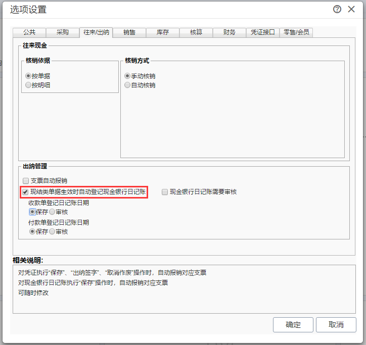 1. 【系统管理】-【选项设置】-【往来/出纳】中,勾选【现结类单据自动生成日记账】。