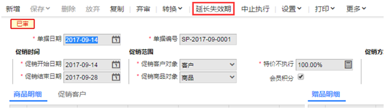 A:点击促销方案表头的“延长失效期”,可以更改促销方案的失效时间,但是只能推后不能提前,并且促销内容不能修改。