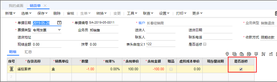 Step2. 当有商品需要进行返修时,由于维修周期比较长,维修部需要根据打印出来的维修单,确认对应的商品进行维修。可以根据原销货单,生成退货单,针对需要返修的明细行,勾选上返修。