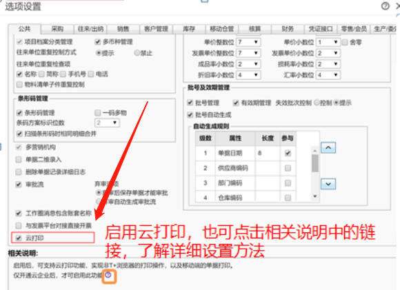 在选项设置中的【公共】项目下,勾选“云打印”栏,启用云打印。