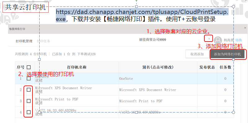 2. 云打印机:共享云打印机需要在非T+浏览器中先下载并安装【畅捷网络打印】插件,并共享打印机。