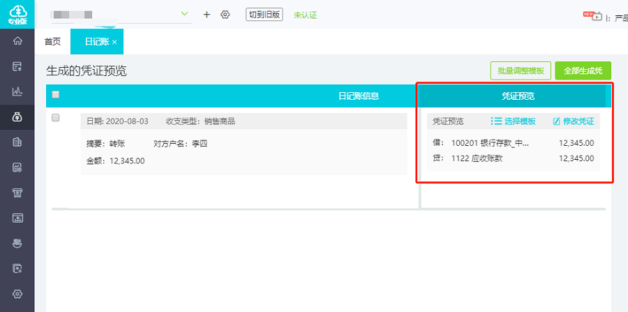 ②导入成功后,通过日记账生成凭证。勾选银行流水-点击【生成凭证】-查看凭证预览-如需调整,可点击【选择模板】或【修改凭证】修正。