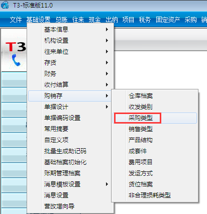 用友T3标准版11.0如何添加采购类型?