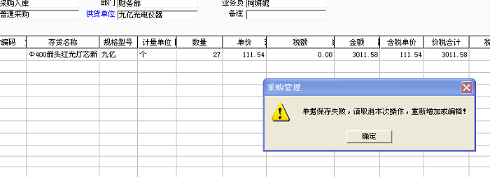 用友t3录入采购入库单保存时提示:“单据保存失败,请取消本次操作,重新增加或编辑!”是怎么回事?