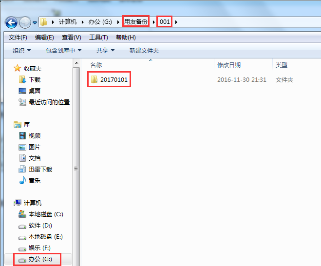 一、在除C盘外的其他磁盘创建一个文件,如用友备份文件夹,在文件夹以账套建一个文件夹,在账套文件夹里,建一个日期的文件夹(如图);