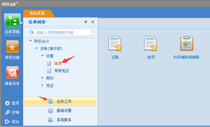3.打开业务工作中的财务会计》总账》设置》选项按钮。