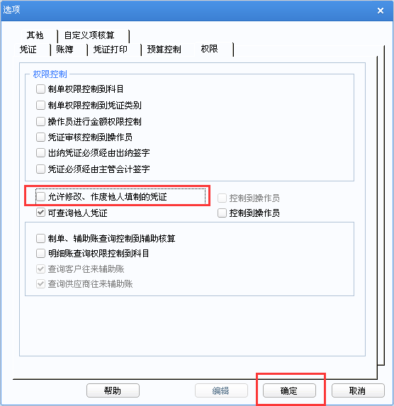 5.将允许修改丶作废他人凭证的勾勾取消点击确认。