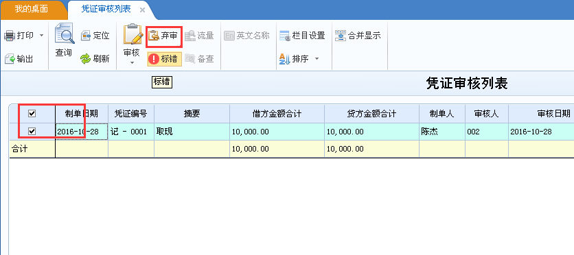 6.在需要反审核的凭证线面打勾,点击上面的弃审。