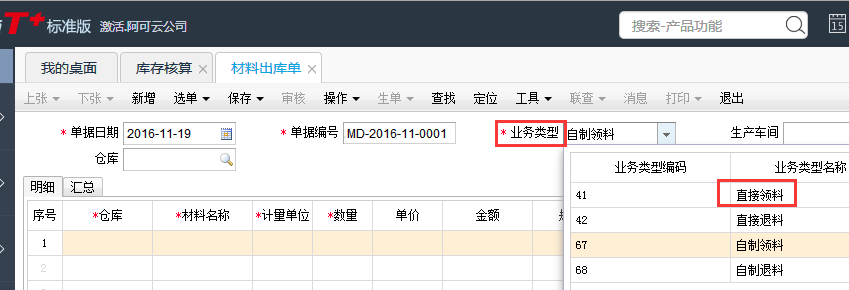 自制领料(由生产加工单生成材料出库单时默认业务类型);