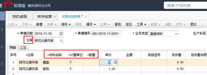 如何填制用友T+12.1材料出库单?
