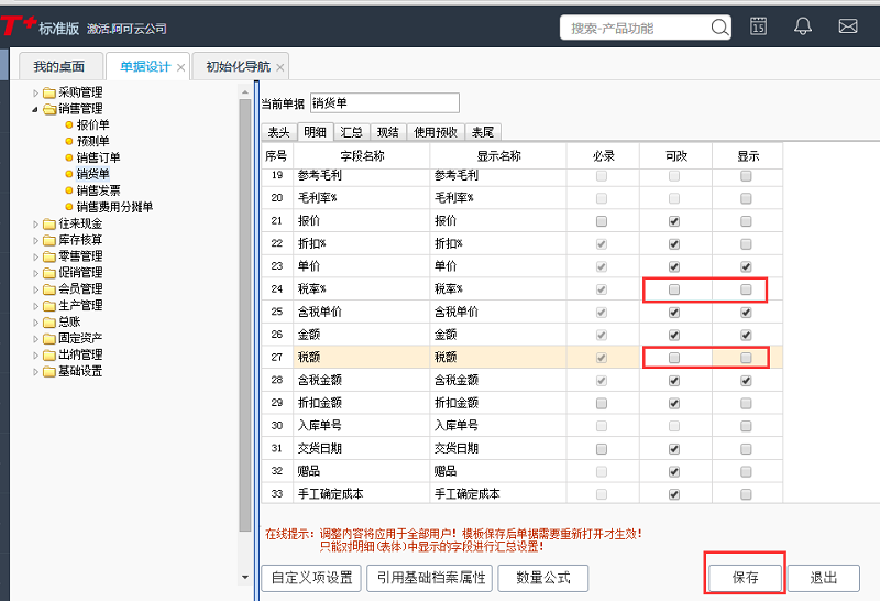3、单据明细项目中,取消勾选税率、税额后保存单据设计。