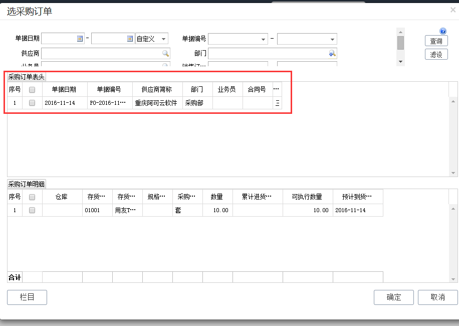 3、查询勾选需要生成进货单的采购订单,点击确定;