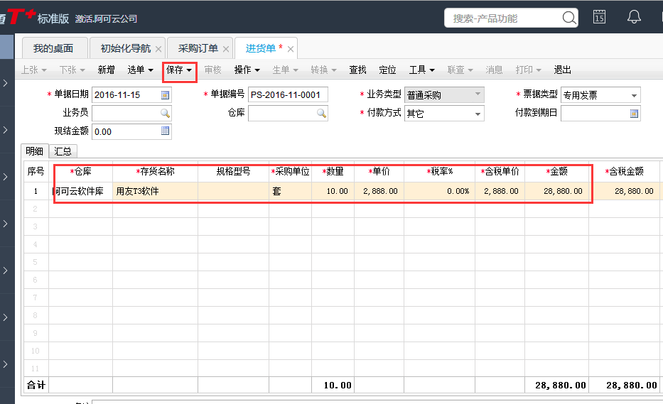 4、查看往来单位、商品数量、金额等明细无误后点击保存按钮。