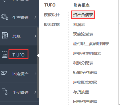 2、左边模块列表点击T-UFO---资产负债表;