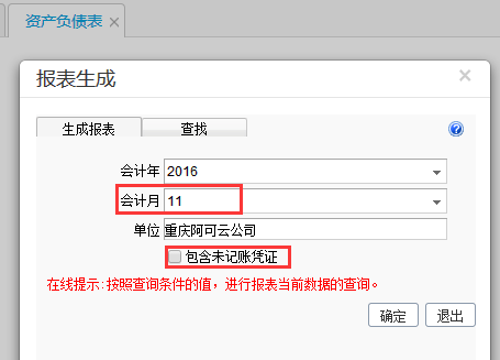 3、选择生成资产负债表、月份、是否包含未记账。然后点击确定;