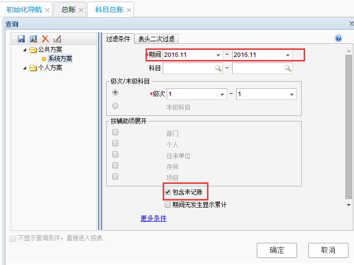 3、选择查询科目、期间、包含未记账;