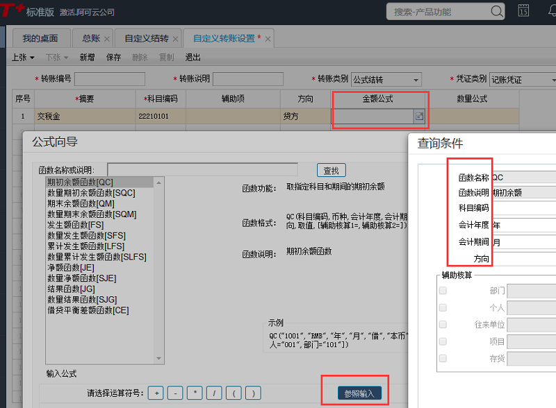 4、填写结转科目、方向,设置结转公式。
